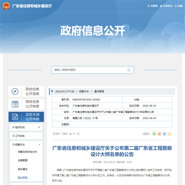 2022年8月30日,廣東省住房和城鄉(xiāng)建設(shè)廳網(wǎng)站發(fā)布第二屆廣東省工程勘察設(shè)計(jì)大師評選結(jié)果,公司總工程師徐波、首席專家靳守杰、特聘專家王建新榜上有名,獲評廣東省工程勘察設(shè)計(jì)大師。同時(shí)獲評3位廣東省工程勘察設(shè)計(jì)大師,體現(xiàn)了公司在尖端科技人才培養(yǎng)、專家團(tuán)隊(duì)建設(shè)的發(fā)展優(yōu)勢,標(biāo)志著公司在人才工程建設(shè)方面取得了階段性勝利,為企業(yè)技術(shù)創(chuàng)新、成果轉(zhuǎn)化、人才培養(yǎng)等方面提供了更廣闊的發(fā)展空間。