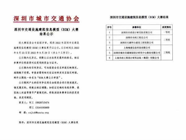 日前,由深圳市交通運(yùn)輸局組織舉辦的深圳市首屆交通設(shè)施建筑信息模型(BIM)大賽落下帷幕,公司在眾多參賽單位中脫穎而出,摘得桂冠,榮獲大賽唯一一等獎,標(biāo)志著公司BIM/CIM團(tuán)隊(duì)和技術(shù)實(shí)力處于行業(yè)領(lǐng)先水平,體現(xiàn)了對公司近十年BIM/CIM發(fā)展成績的肯定和認(rèn)可。