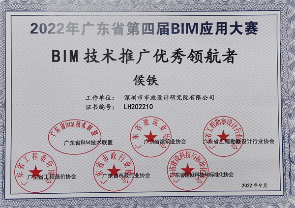2023年3月15日,由廣東省BIM技術(shù)聯(lián)盟、廣東省建筑業(yè)協(xié)會、廣東省工程勘察設計行業(yè)協(xié)會等行業(yè)協(xié)會聯(lián)合舉辦的“廣東省第四屆BIM應用大賽”頒獎典禮暨第七屆廣東省BIM發(fā)展論壇在廣州順利舉辦。經(jīng)大賽專家委員會評審,深圳市政院榮獲“BIM應用示范單位”榮譽稱號。尤值一提的是,廣東省共評選10家“BIM應用示范單位”,深圳市政院為深圳市唯一獲獎單位。此外,深圳市政院參選項目獲設計組一等獎,深圳市政院數(shù)字業(yè)務總監(jiān)侯鐵榮獲“BIM技術(shù)推廣優(yōu)秀領(lǐng)航者”稱號,賴華輝博士榮獲“BIM技術(shù)應用杰出人才”稱號。