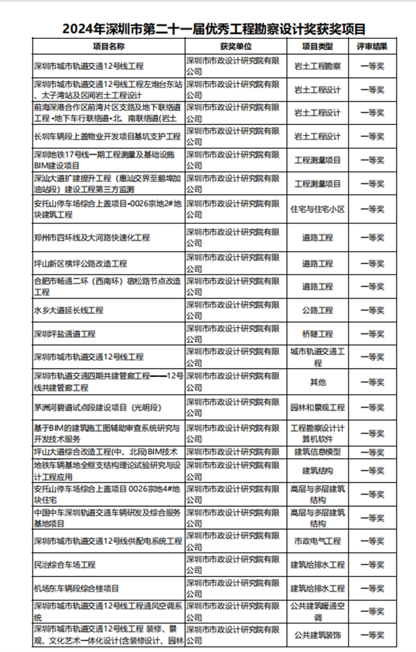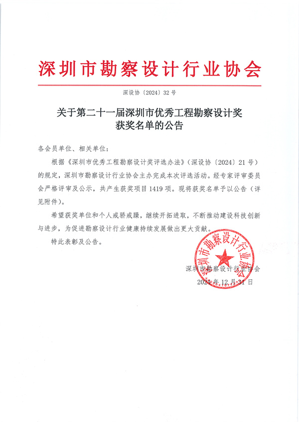 2024年深圳市第二十一屆優(yōu)秀工程勘察設(shè)計(jì)獎(jiǎng)評(píng)選結(jié)果正式揭曉。經(jīng)過(guò)三輪嚴(yán)格的評(píng)審流程,公司共82個(gè)項(xiàng)目獲獎(jiǎng),包括一等獎(jiǎng)25項(xiàng)、二等獎(jiǎng)32項(xiàng)、三等獎(jiǎng)25項(xiàng)。獎(jiǎng)項(xiàng)覆蓋了工程勘察與巖土工程、住宅及住宅小區(qū)設(shè)計(jì)、市政公用工程設(shè)計(jì)等13個(gè)主要關(guān)鍵領(lǐng)域。