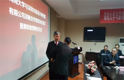 許華林副總經(jīng)理與粟石軍主任分別代表雙方簽訂戰(zhàn)略合作協(xié)議后,舉行了陳宜言董事長兼職教授受聘儀式。段獻忠校長宣讀湖南大學(xué)聘任決定,并為陳董事長頒發(fā)聘書、佩戴校徽。陳董事長還贈送了由其主編的廣東省地方標準《波形鋼腹板預(yù)應(yīng)力混凝土組合箱梁橋設(shè)計與施工規(guī)程》及學(xué)術(shù)專著《波形鋼腹板預(yù)應(yīng)力混凝土橋設(shè)計與施工》。