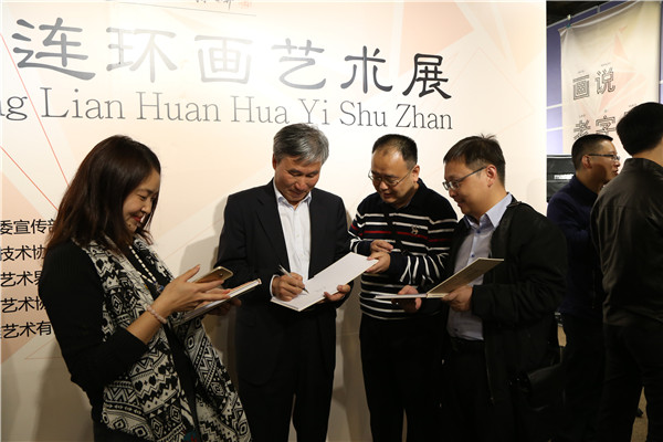 董事長陳宜言大師在連環(huán)畫展廳被參觀者圍繞簽名