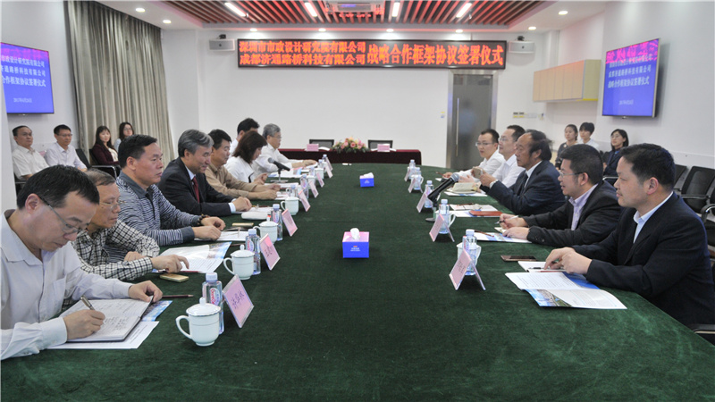 2017年4月24日下午,我公司與成都濟通路橋科技有限公司(以下簡稱“濟通科技”)戰(zhàn)略合作框架簽署儀式在公司一樓技術(shù)交流中心舉行,董事長陳宜言設(shè)計大師和濟通科技伍廷貴董事長代表雙方簽字。蔡明總經(jīng)理、宋榮亮主席、郭明副書記、王建新副總經(jīng)理、張健君副總經(jīng)理、許華林副總經(jīng)理、徐波總工程師以及相關(guān)部門負責人和專業(yè)總工,濟通科技伍大成總經(jīng)理、趙鵬賢副總經(jīng)理,鄒貽軍技術(shù)總監(jiān)、技術(shù)部高建主任出席簽署儀式。儀式由我公司黨委副書記、紀委書記、工會主席郭明主持。