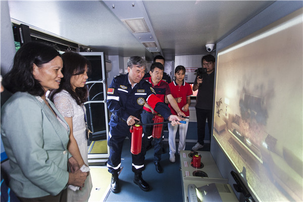 陳宜言董事長(zhǎng)在消防宣傳車上體驗(yàn)家居滅火