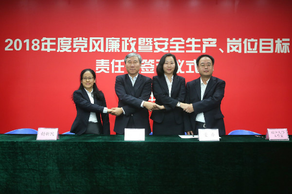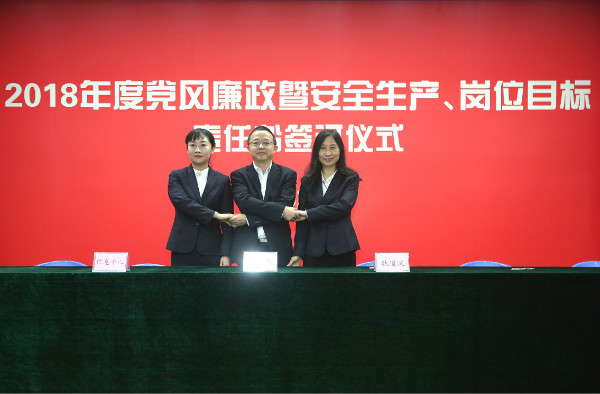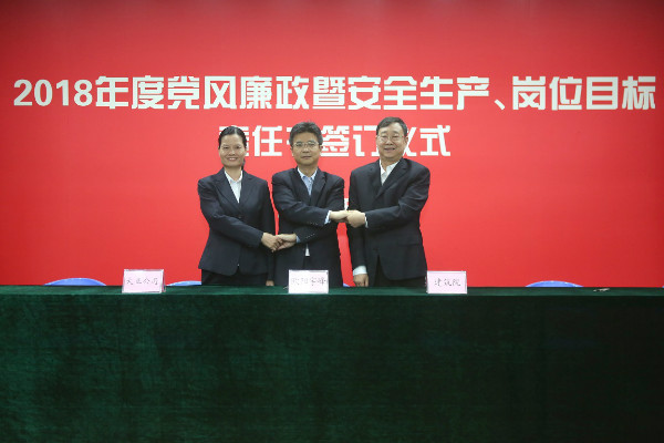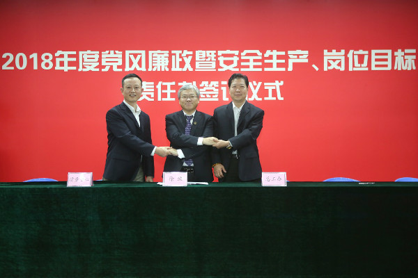 儀式開始,黨委書記、董事長陳宜言與黨委副書記、總經(jīng)理蔡明和黨委副書記、紀(jì)委書記、工會主席郭明簽署了《2018年度崗位目標(biāo)責(zé)任書》、《2018年度黨風(fēng)廉政責(zé)任書》及《2018年度安全生產(chǎn)責(zé)任書》。黨委副書記、總經(jīng)理蔡明與副總經(jīng)理歐陽宇峰、副總經(jīng)理王建新、副總經(jīng)理張健君、副總經(jīng)理許華林、總工程師徐波簽署責(zé)任書。緊接著,各分管領(lǐng)導(dǎo)與分管部門負(fù)責(zé)人簽署責(zé)任書。