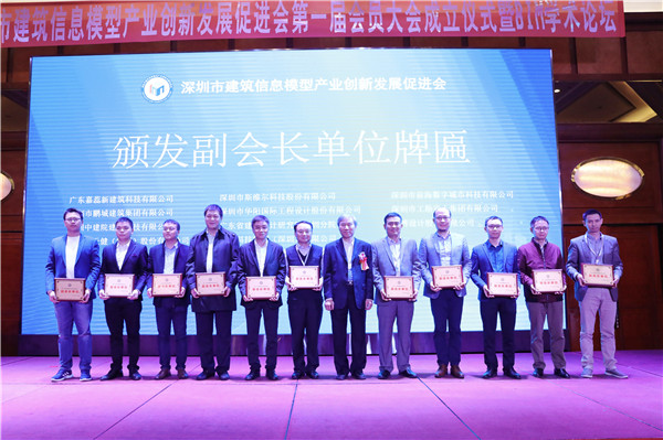 會(huì)議宣讀了促進(jìn)會(huì)第一屆理事會(huì)、監(jiān)事會(huì)成員名單。隨后,蔡瀛、高爾劍、王寶玉、黃強(qiáng)、陳宜言等領(lǐng)導(dǎo)嘉賓共同為促進(jìn)會(huì)揭牌,并向會(huì)長(zhǎng)單位深圳市市政設(shè)計(jì)研究院有限公司、監(jiān)事長(zhǎng)單位深圳蘭灣快鍵建筑科技有限公司和以廣東嘉蕊新建筑科技有限公司為代表的十一家副會(huì)長(zhǎng)單位頒發(fā)牌匾,為總顧問(wèn)黃強(qiáng)、秘書(shū)長(zhǎng)辛業(yè)洪、副秘書(shū)長(zhǎng)李良勝與浦至頒發(fā)聘書(shū)。大會(huì)還舉行了深圳市住房和建設(shè)局黃強(qiáng)BIM工作室簽約及揭牌儀式。