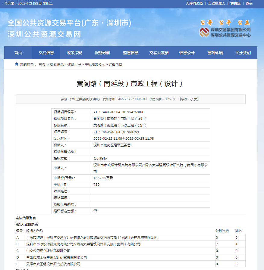 2022年2月22日,經(jīng)深圳市公共資源交易中心中標(biāo)公示通過,深圳市政院與同濟(jì)大學(xué)建筑設(shè)計(jì)研究院(集團(tuán))有限公司(聯(lián)合體)在深圳市龍崗區(qū)建筑工務(wù)署黃閣路(南延段)市政工程(設(shè)計(jì))項(xiàng)目公開招標(biāo)中成...